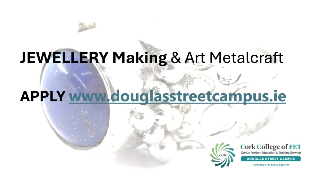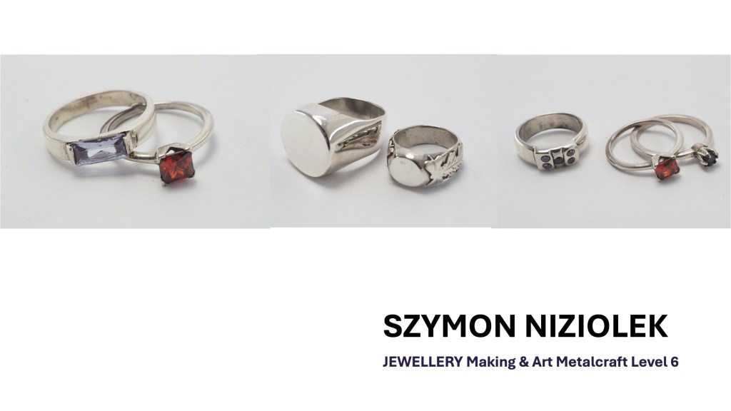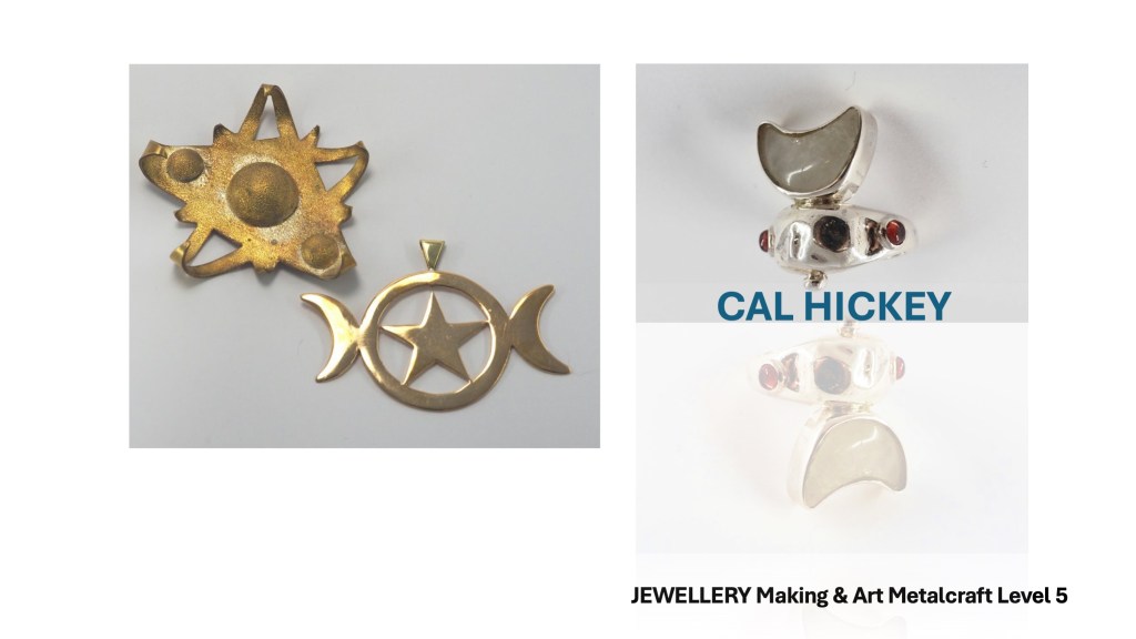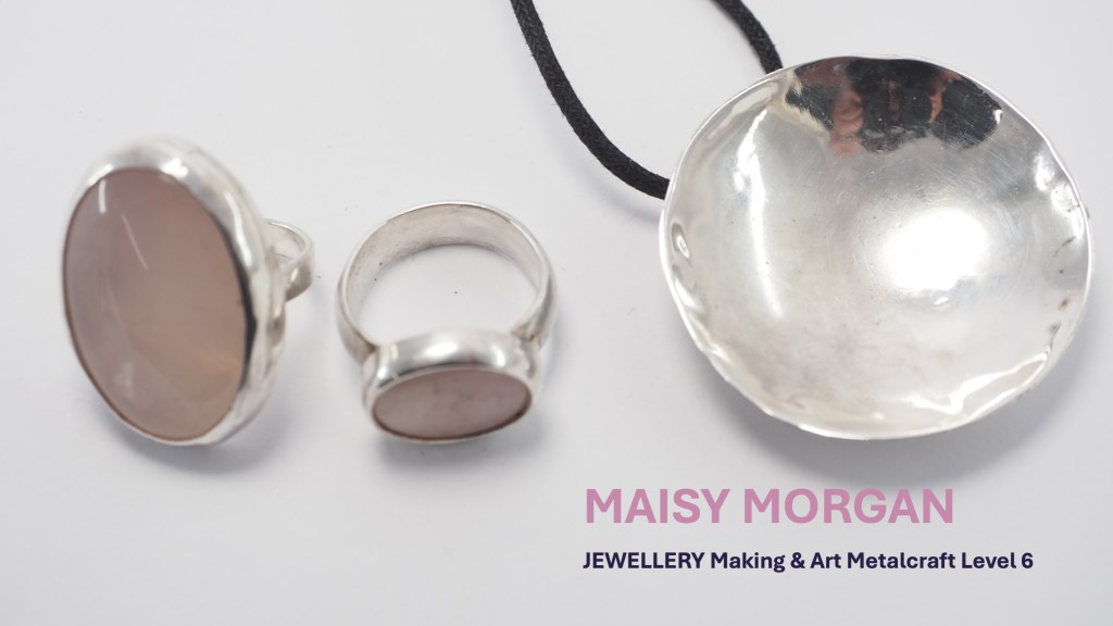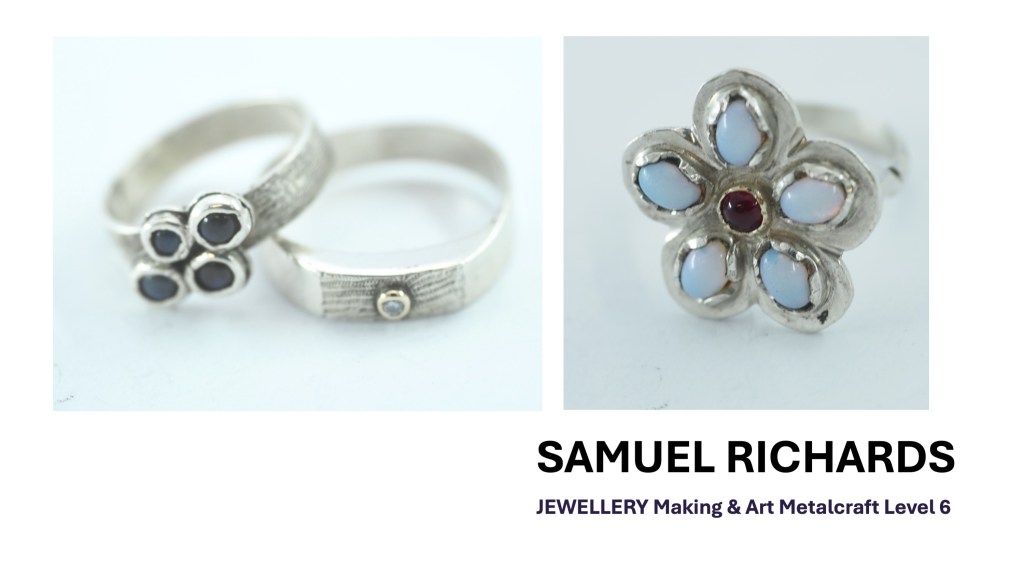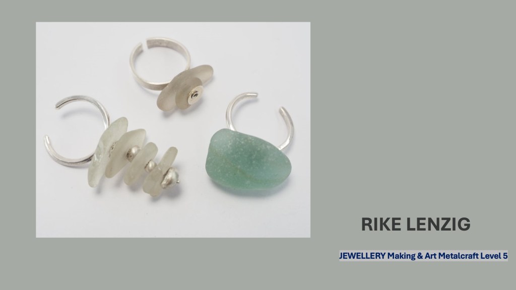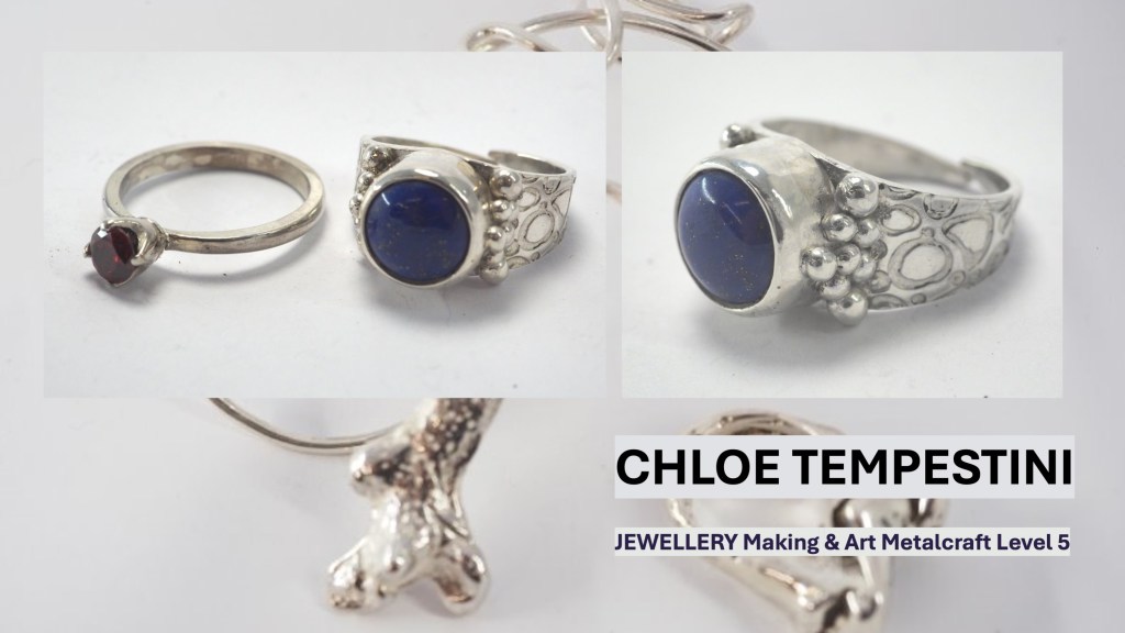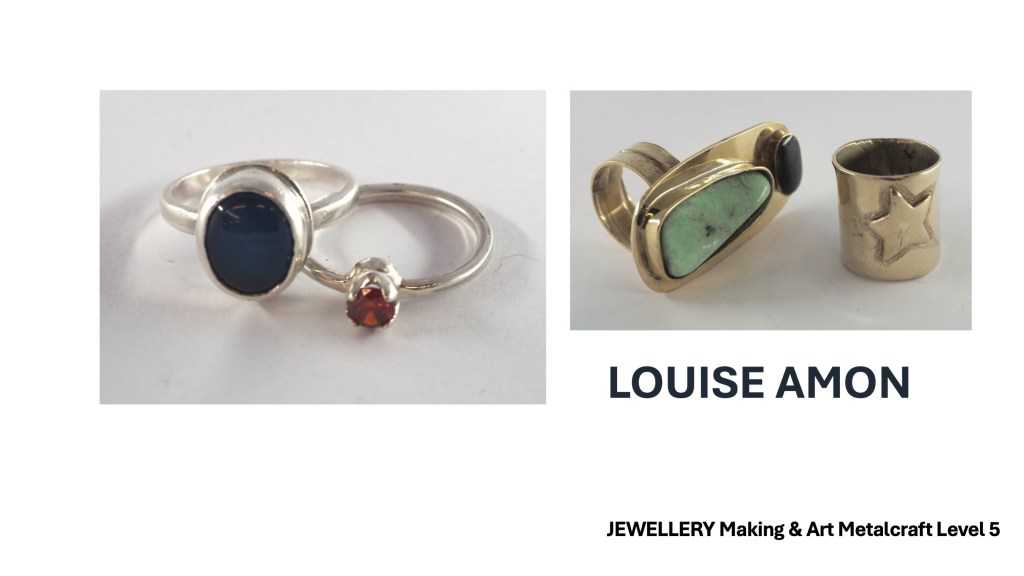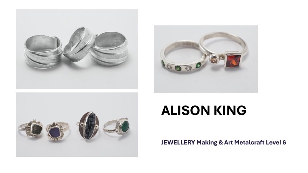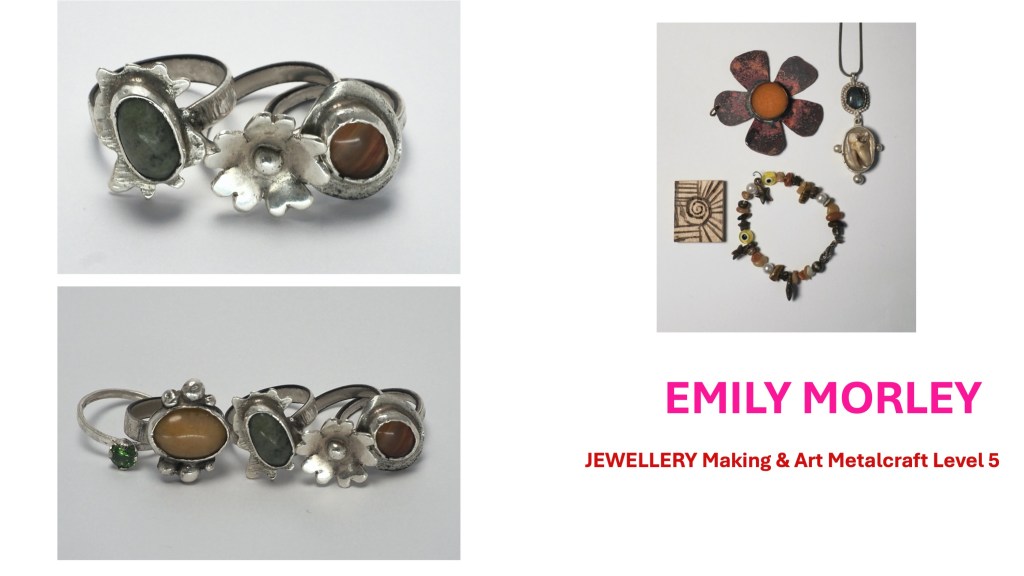 The Jewellery Course is an inclusive course designed to appeal to a broad range of people with an interest in metalwork techniques and jewellery making. No experience is needed, and all ages are welcome. There is a Level 5 qualification in the first year which can then lead on to a second year Level 6 qualification. The work below represents work produced by the Level 5 students, and I think shows the broad range of activities possible on the course.