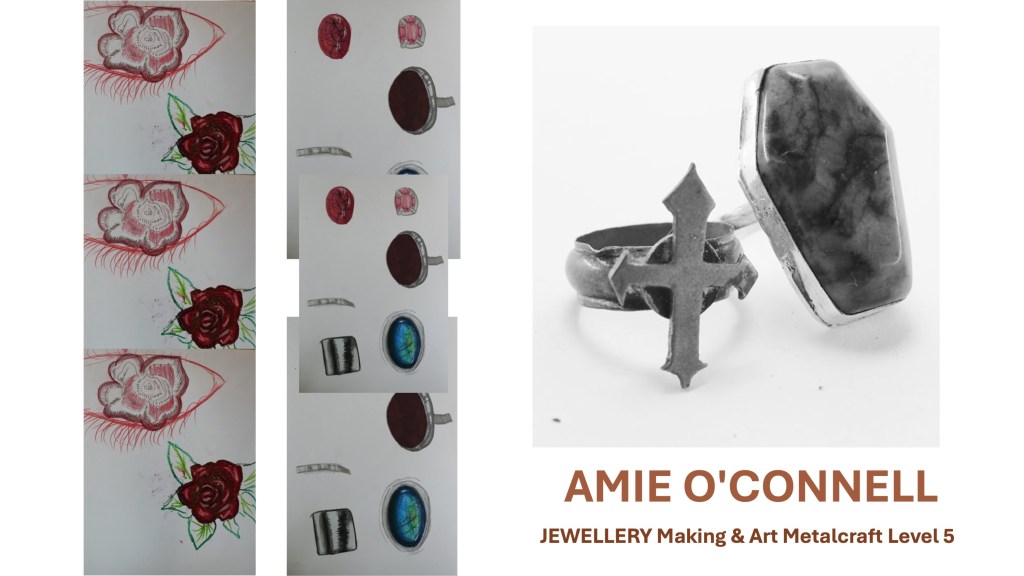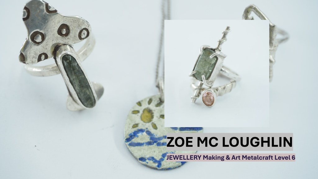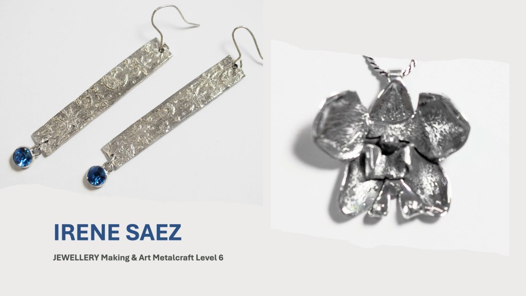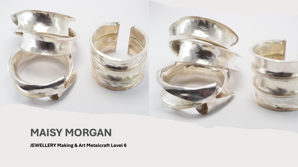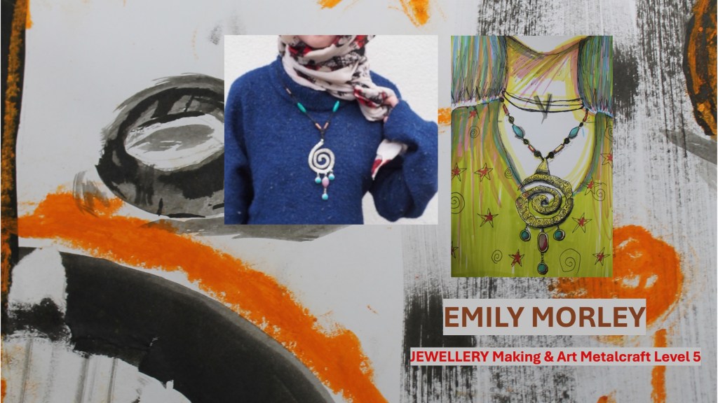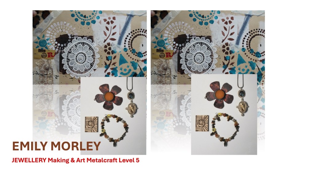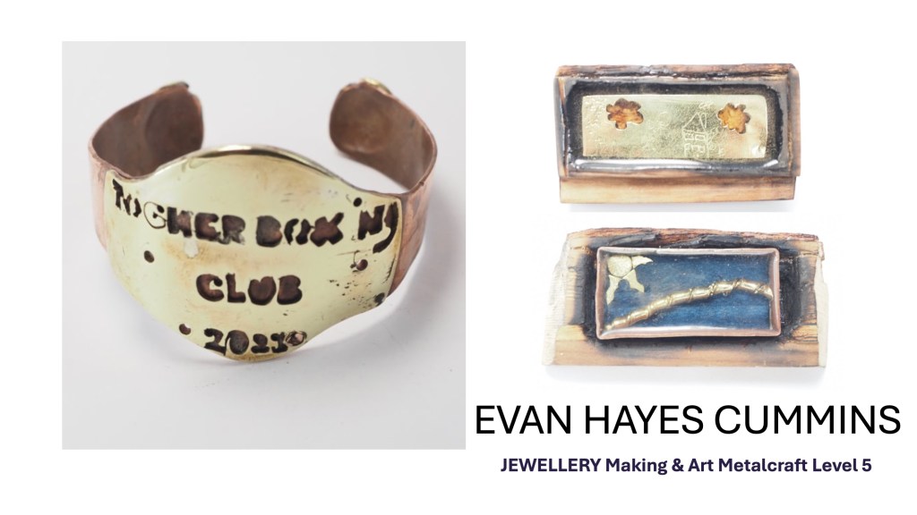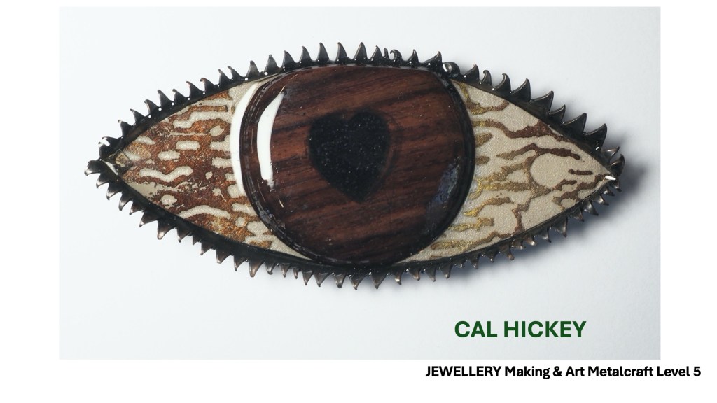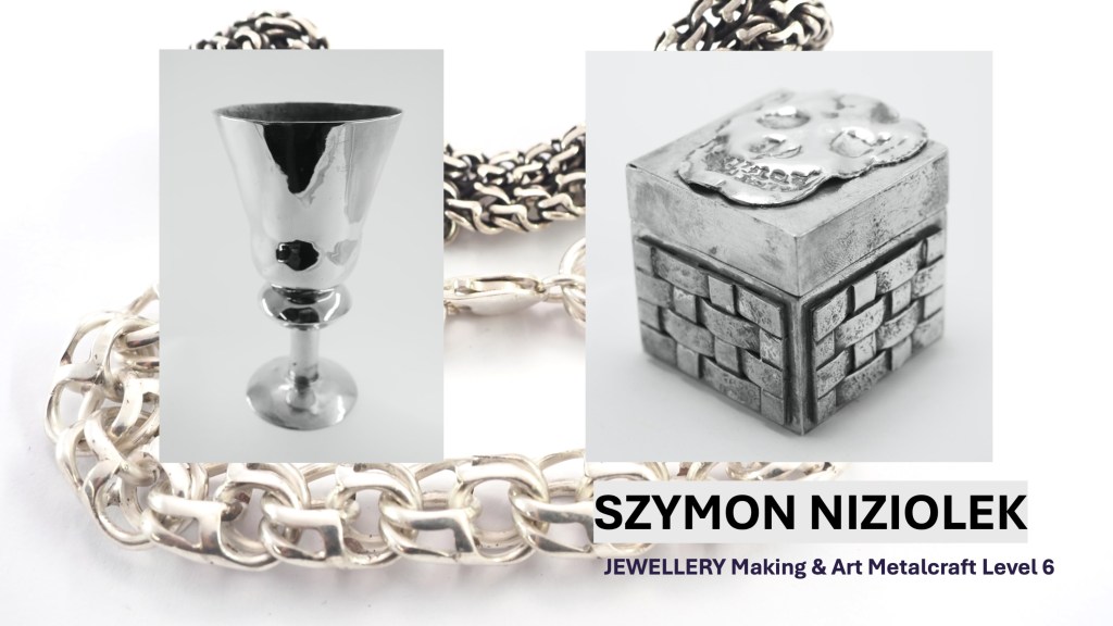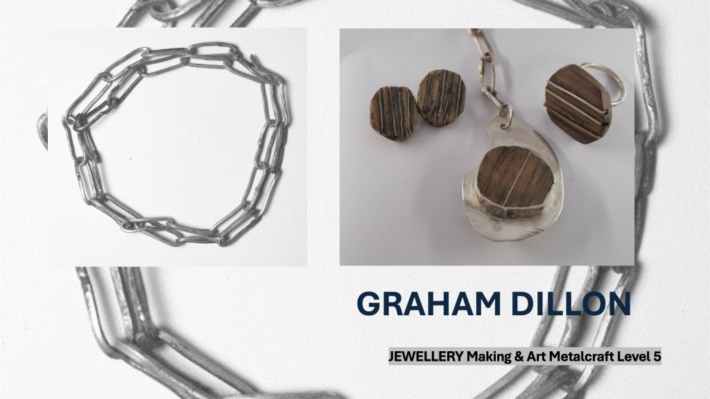 The Jewellery Course is an inclusive course designed to appeal to a broad range of people with an interest in metalwork techniques and jewellery making. No experience is needed, and all ages are welcome. There is a Level 5 qualification in the first year which can then lead on to a second year Level 6 qualification. The work below represents work produced by the Level 5 students, and I think shows the broad range of activities possible on the course.