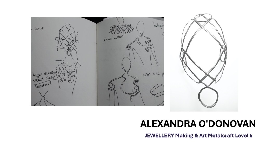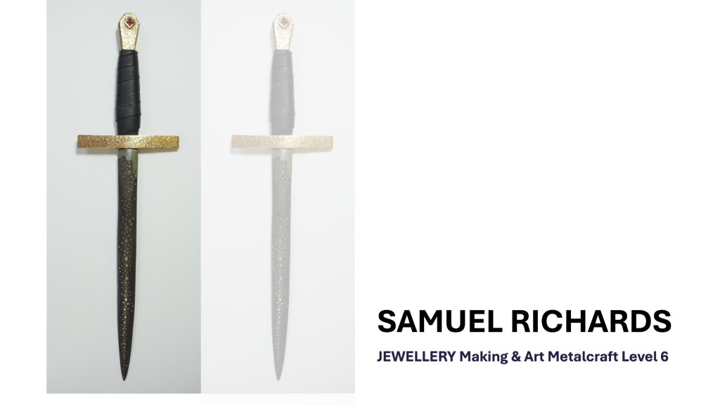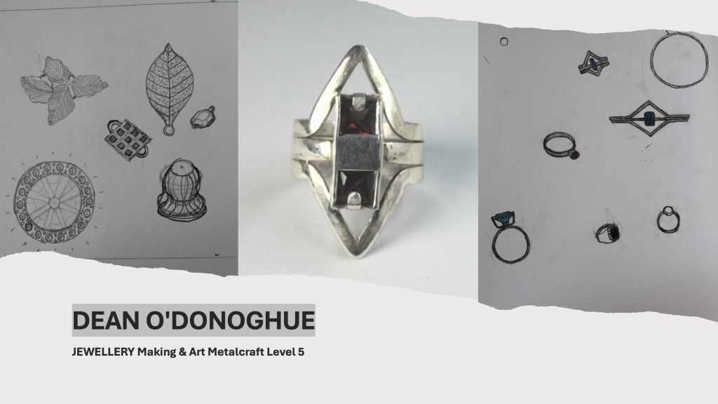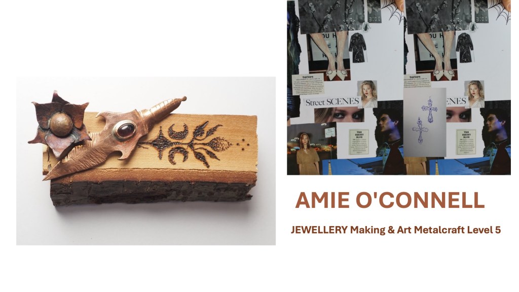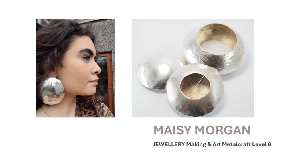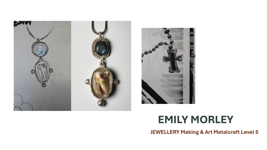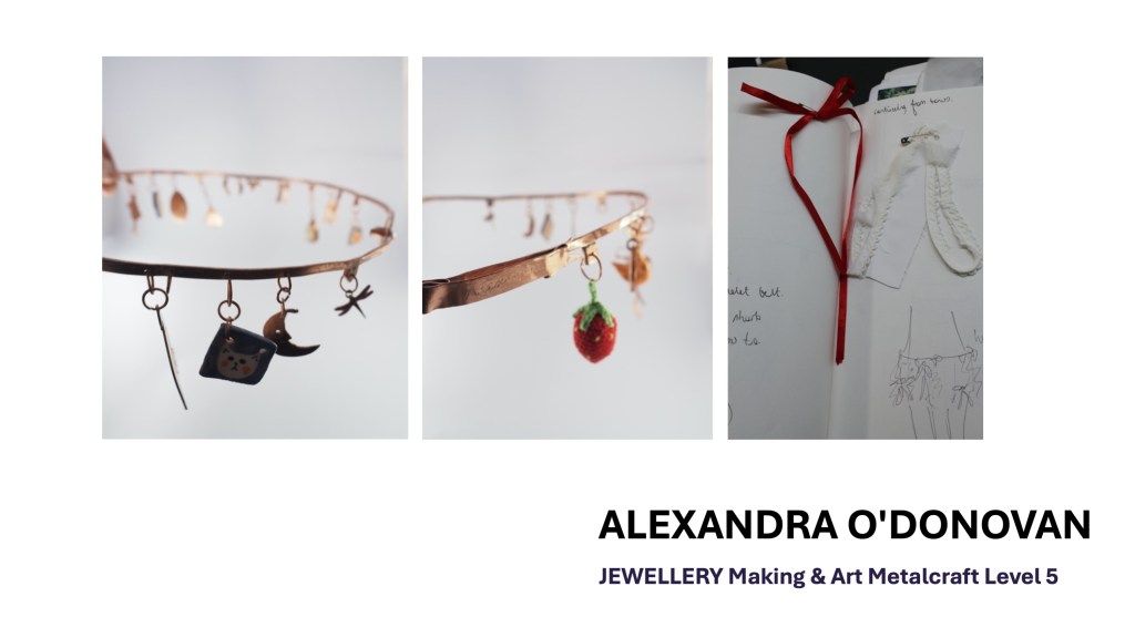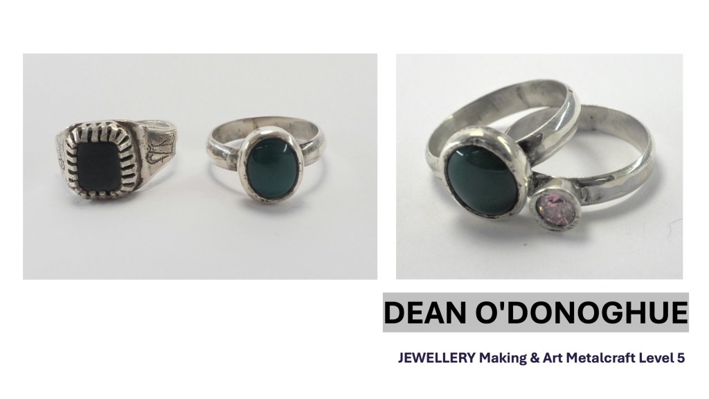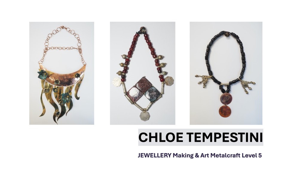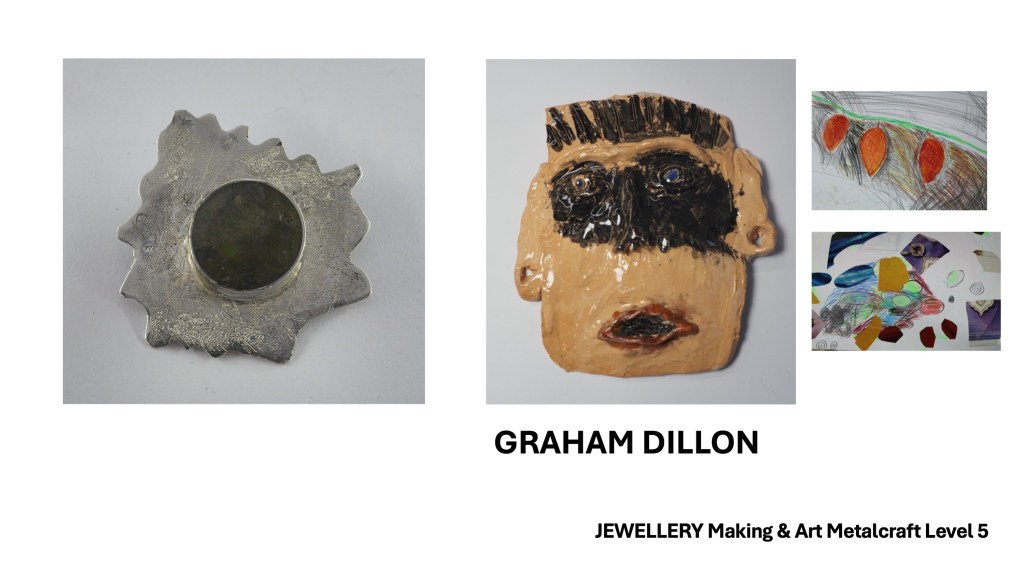 The Jewellery Course is an inclusive course designed to appeal to a broad range of people with an interest in metalwork techniques and jewellery making. No experience is needed, and all ages are welcome. There is a Level 5 qualification in the first year which can then lead on to a second year Level 6 qualification. The work below represents work produced by the Level 5 students, and I think shows the broad range of activities possible on the course.